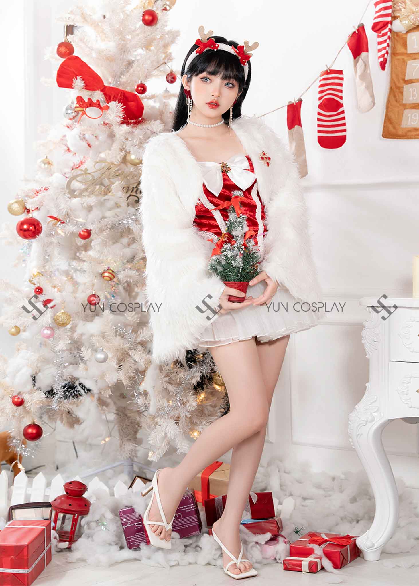 Một bộ váy noel phong cách tiểu thư điệu đà kèm áo khoác lông xù dày dặn là một gợi ý không tệ dành cho các nàng khi muốn có sự thay đổi và nổi bật trong mùa Noel sắp tới. Không phải là màu đỏ đặc trưng mà thay vào đó là set áo quây và áo choàng bằng lông xù kết hợp với chân váy đỏ ôm bó sát. Phụ kiện hóa trang đi kèm cùng bộ đồ là chiếc thắt lưng trắng.