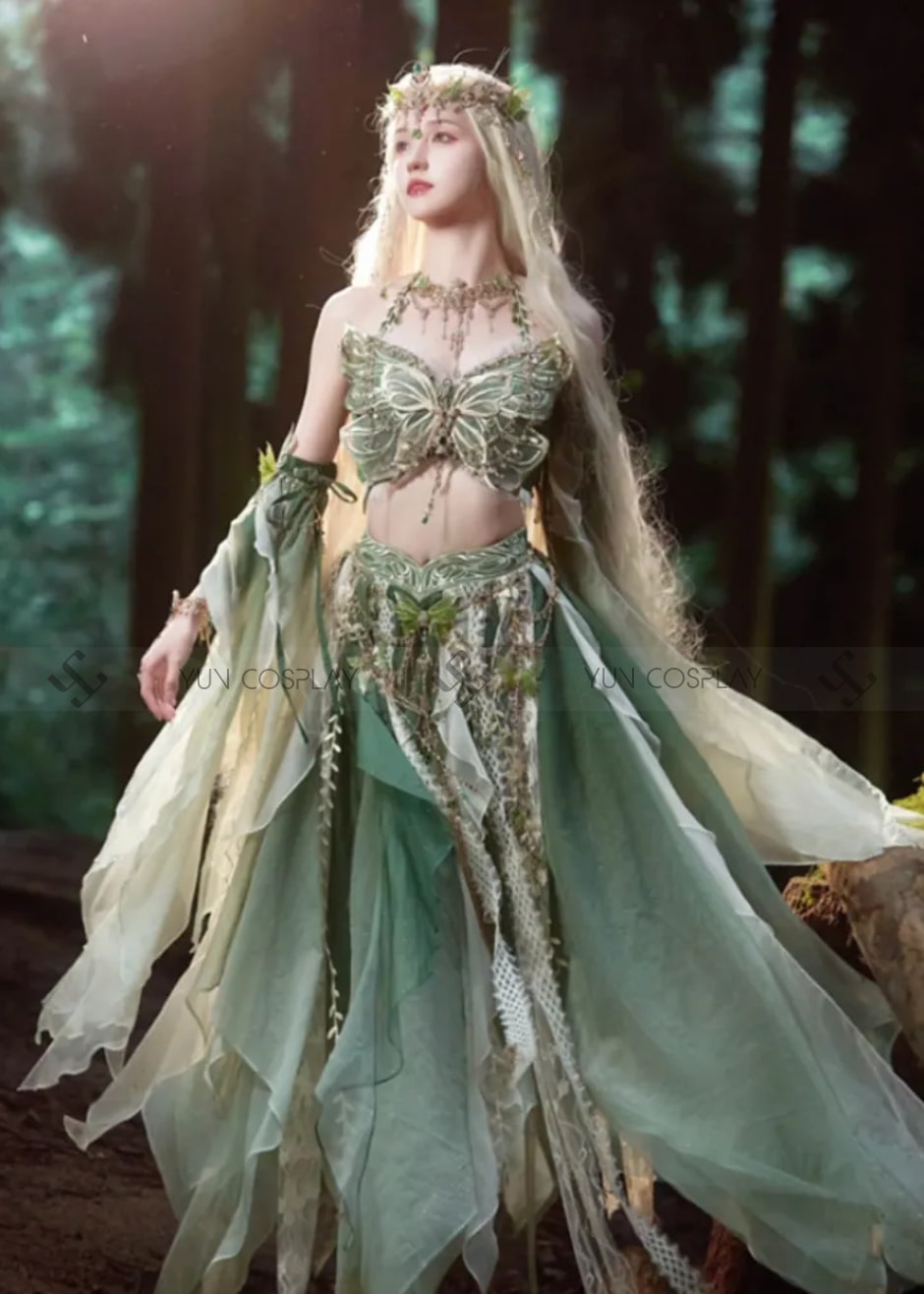 Trang phục tộc tiên nữ Fairy Elf mang phong cách huyền bí và lộng lẫy, gợi lên hình ảnh một nàng tiên bước ra từ rừng sâu huyền thoại. Bộ trang phục được thiết kế với tông màu xanh lá chủ đạo, tượng trưng cho thiên nhiên và sự hòa hợp với rừng cây. Điểm nhấn nổi bật là phần áo và váy được đính họa tiết cánh bướm tinh xảo, tạo cảm giác nhẹ nhàng và bay bổng.